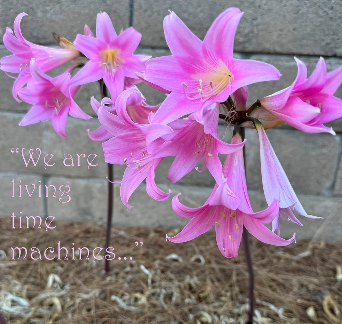 This blog incorporates my love of time travel-related themes in literature and film and The Naked Lady blooms in my backyard. I will also talk about why old people cry (a lot), tell stories nobody wants to hear, and why we get so intensely sentimental. That’s because we are living time machines. We are all the ages we have ever been as quoted by several people including myself.